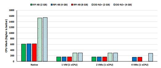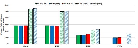 For the rest of this paper, the Debian VMs were configured with 512 MB of RAM as recommended in [27]. It means that due to limitations of memory, only 2 VMs could be run simultaneously in the RPi 4B with 2 GB and the ODROID-N2+ with 2 GB. Hence, in Figures 7, 8, 9, 11, 12, 13, 14, 15, 17, 20 and 21, there are no bars/results in the case of 4 VMs for the RPi 4B with 2 GB and the ODROID-N2+ with 2 GB.
