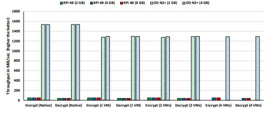 Figure 21 depicts the encryption/decryption throughputs for AES-256. As can be seen, the ODROID-N2+ significantly outperformed the RPi 4B due to the hardware-accelerated support for AES. The amount of RAM of the SBCs did not make a significant difference. As mentioned in Section 5, there are no results for 4 VMs in the case of the RPi 4B with 2 GB and the ODROID-N2+ with 2 GB, due to memory limitations. The assessment of Botan does not take advantage of the multicore CPU, hence the experiments gave the “same” results with 1, 2, or 4 VMs. The differences between the native experiments and those done with VMs were noticeable only in the case of the ODROID-N2+.