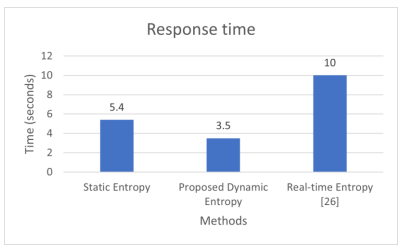 Figure 9 compares the response time between the proposed dynamic method, static threshold and real-time entropy method [26] with the response time of the dynamic method being the fastest. The response time of our simulation and practical model is similar. In our model, we use a window size of 50 packets to evaluate the entropy value and the response time of about 3.5 seconds, which is much faster than the response time of 10 seconds corresponding to the window size used in the paper [26]