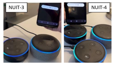 To extend the previous single and dual-device attacks [19], we outline a one-to-many design common to many public events where an audible broadcast might embed an inaudible command within the silence and effectively trigger an entire crowd. Examples include a public announcer (PA system), a live online broadcast (YouTube or Facebook live), a concert hall, or a network of home devices (Alexa groups). This version extends the one-device and two-device attack surface to any number we subsequently call NUIT-N (Near Ultrasonic Inaudible Trojan-N). We demonstrate this phenomenon in a straightforward setup as one broadcasting device (phone) that inaudibly controls multiple home devices simultaneously. In Figure 7, the NUIT signal sends “Alexa, what’s the weather?” to both devices inaudibly, thus fulfilling the (N) requirement at a basic level. Video demonstration replays are available online [84].
