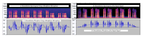 Running the demodulation algorithm on the attack signal captured by an inexpensive microphone reveals reversibility in ambient noise (Figure 8). The slight degradation in the signal quality appears in both the spectrogram and waveform representations of the signal. The spectrogram shows that the demodulation recovers energy around 3kHz, while the digital signal recovers roughly 6kHz (Figure 8). Aside from the ambient noise, a potential factor for the loss in signal quality is the speaker and microphone’s frequency response.