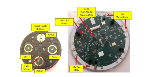 Figure 3 Printed Circuit Board (PCB 2) on Echo Dot 2 Highlights the Sensory Inputs for Voice and Touch Commands