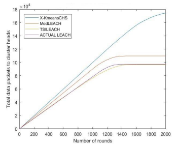 Figure 10 . Total Data Packets to Cluster Heads for extended K-Means CHS, MOD-Leach, TSI-Leach and Actual Leach