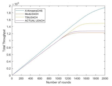 Figure 11 . Total Throughput of the network in extended K-Means CHS, MOD-Leach, TSI-Leach and Actual Leach