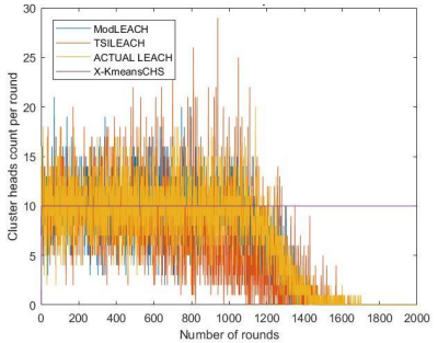 Figure 12 . Number of cluster head per round for extended K-Means CHS, MOD-Leach, TSI-Leach and Actual Leach