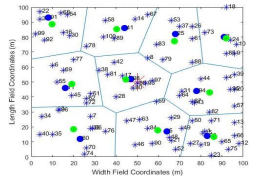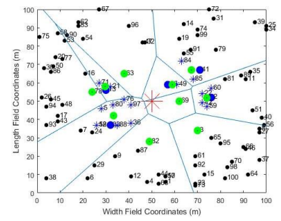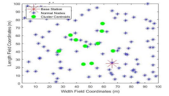 To depict how nodes are randomly placed with k-means centroid marks. The results display how 100 nodes are randomly arranged in geographical location of X and Y coordinates, where the blue asterisk represents the normal nodes, red asterisk shows the base station and green circle are the centroid markers as shown in Figure 3.