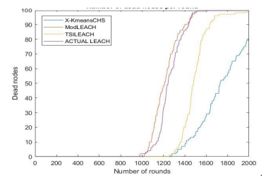 Figure 6 . Number of dead nodes per round in Extended K-Means CHS, MOD-Leach, TSI-LEACH and Actual Leach