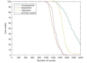 Figure 7 . Number of live node per round in proposed Extended K-Means CHS, MOD-Leach, and TSI-Leach and Actual Leach