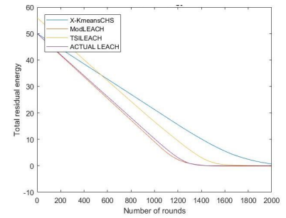 Figure 8 . Average remaining energy after a number of rounds extended K-Means CHS, Mod-Leach, TSI-Leach and Actual LEACH