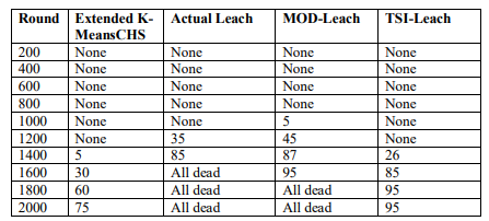 It is evident that the first node in Extended K-Means CHS algorithm died at approximately 1300 round, MOD-Leach approximately 950 round, TSI-Leach approximately 1250 round and actual Leach 1050 round respectively. At the end of simulation, it is evident that the number of dead nodes in Extended K-Means CHS was 75 and TSI-Leach was 95 respectively while MOD-Leach and actual Leach all the nodes had died. This information is shown in Table 4.