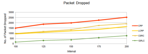 Packet dropping ratio for the proposed routing protocol IQRLC is shown in Figure 4. It is observed that CRP has a higher packet- dropping ratio compared to LCRP and IQRLC. Average packet-dropping ratio in IQRLC is 15.00% less than CSRC, 12.50% less than LCRP, and 24.51% fewer than CRP. IQRLC selects less interference channels with an epsilon greedy approach that results in less packet drop during transmission