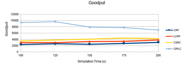 Due to the minimum number of channel switching and optimal channel selection approach, good put in IQRLC is better than LCRP and CRP. It is shown in Figure 6. IQRLC keeps all the available paths between the source and destination. Therefore, it immediately switches to another available path in the situation of route failure. The average good put in IQRLC is 50.91% more than CSRC, 59.63% more than LCRP, and 67.54% more than CRP.