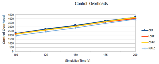 Similarly, control overhead in IQRLC is less than in LCRP and CRP. It is shown in Figure 8. Average control overhead in IQRLC is 6.8% less than CSRC, 6.38% less than LCRP, and 9.26% less than CRP.