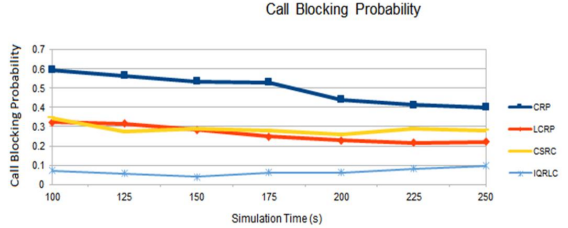 Call blocking probability (CBP) is the ratio of a number of blocked users to the total number of users. The Simulation result for call blocking probability (CBP) is shown in Figure 9. It is observed that/ CBP in IQRLC is less than LCRP and CRP. The Average CBP in IQRLC is 73.22% less than LCRP, 76.60% less than CSRC and 85.81 less than CRP. Comparison of the performance of proposed work IQRLC with the existing routing protocols shown in table 5.
