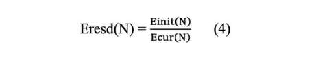 4) The Residual energy metric: Residual energy is a node metric that shows a node’s leftover energy. It represents the Expected Lifetime of a node and helps prevent selecting nodes with low residual energy, thereby improving the network’s lifetime. The residual energy of a node, Eresd(N), is computed as the ratio of the node’s initial energy, Einit(N), to the current energy of the node, Ecur(N), as given in Equation (4)