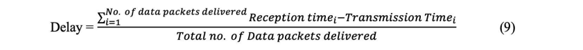 End-to-end delay or latency represents the time needed to transfer a packet from a transmitter to a receiver. It is calculated as the ratio of the difference between the data reception time and the data sending time divided by the number of data packets delivered effectively, as given in Equation (9) [26].