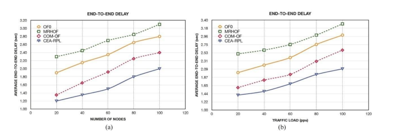 Figure 5(b). shows the impact of increasing traffic load in a network with end-to-end delay. It can be seen that end-to-end delay is directly proportional to the traffic in a network. A network experiences congestion on sudden rise in traffic load, which delays the delivery of packets to their destination. Due to the fact that OF0, MRHOF, and COM-OF do not take network Congestion control into account, an increase in traffic volume causes buffering of packets for an extended period of time in the network, lengthening the delay. As a congestion aware, detecting, and controlling multipath protocol, CEA-RPL may route traffic to the least crowded path to reduce packet queuing. Thus CEA-RPL reduces the end-to-end delay when contrasted with OF0 by 30%, MRHOF by 39%, and COM-OF by 15% on average, during varied traffic loads.