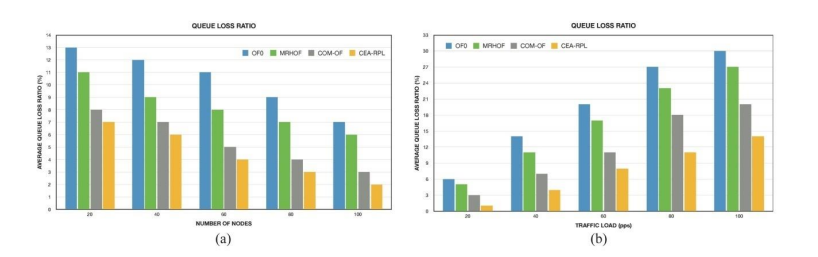 Figure 6(a). compares the average Queue loss ratio with the network density, given a constant traffic rate. It is observed that the queue loss ratio reduces with the increasing network density. As the traffic rate is constant, more nodes to forward the data in the network reduces buffer occupancy at the nodes, thereby reducing congestion and the queue loss ratio in the network. It is evident that the performance of CEA-RPL is superior to that of OFO, MRHOF, and COM-OF as it considers load balancing and Congestion control in the network, which will alleviate the queue loss in the network. It is noticed that the queue loss ratio of CEA-RPL is 60% less when compared to OF0, 49% less when compared to MRHOF, and 21% less when compared to COMOF.