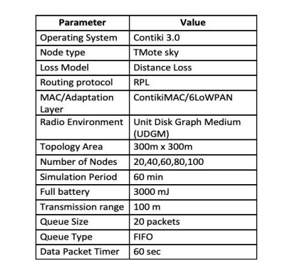 The Contiki OS 3.0 is used with IEEE 802.15.4 communication protocol. For our simulation, we emplo Tmote sky motes, which are wireless sensor modules with fast data rates of 250 kbits/sec and low-power requirements that facilitate compatibility with IEEE 802.15.4 devices [35]. For radio medium, Cooja UDGM (Unit Disk Graph Medium) with distance loss is utilized. The simulation is carried out for 20 to 100 Tmote sky nodes in steps of 20 that are deployed in a 300 x 300 network for 60 minutes. We compare CEA-RPL with COM-OF and the existing OF0 and MRHOF Objective Functions with respect to the density of the network and the traffic load. The performance parameters considered are the power consumption, Packet Receiving Rate, End-to-End Delay, Queue Loss ratio, and Network lifetime. Table 3. presents the simulation parameters considered for the evaluation.