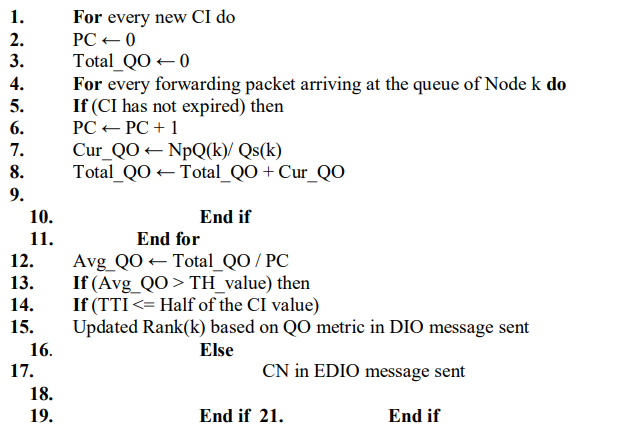 Step 3: A node keeps a buffer for each DIO message it gets from its child nodes, incrementing the child count value and keeping track of the child count as explained in section 3.1. Step 4: The Queue Occupancy metric, as described in Algorithm 1, is used by a node to determine whether its current parent node is congested if it receives a DIO message from that node. If congestion is detected at the parent node, then congestion mitigation is initiated using the Multipath routing technique, as explained in section 3.3. If not, it calculates its rank using CEAOF and updates its position in the DODAG.