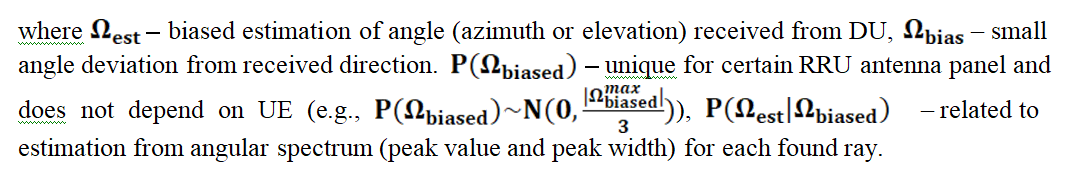 In order to achieve high accuracy of the angular spectrum estimation, precise installation of base station antennas is required as well as stricter requirements for wind load and accuracy of positions of base stations. These issues require to remove bias from estimated AoA and location of UE by correction with averaged by UE estimates of obtained via RT weighted rays and positions. This correction values are calculated at CPU and reported to DU.