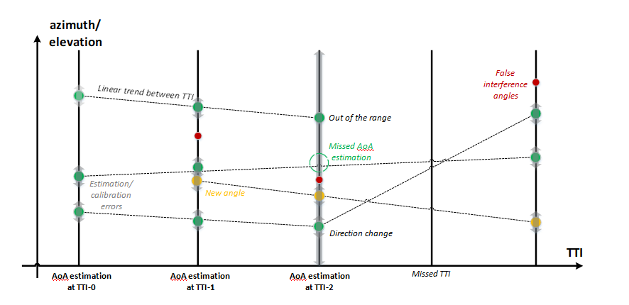 Figure 6 represents assumptions for the developed AoA tracking system. It includes a linear change of noised AoA between TTI (from steering vectors (9) and long distance to tracking object (14)), AoA estimation miss, false AoA detection, sudden AoA change (UE changed traveling direction or got around the corner of the building) and irregular TTI structure. AoA tracking is done for each antenna array and azimuth/elevation independently. Lp fit for a single trend is described in [23].
