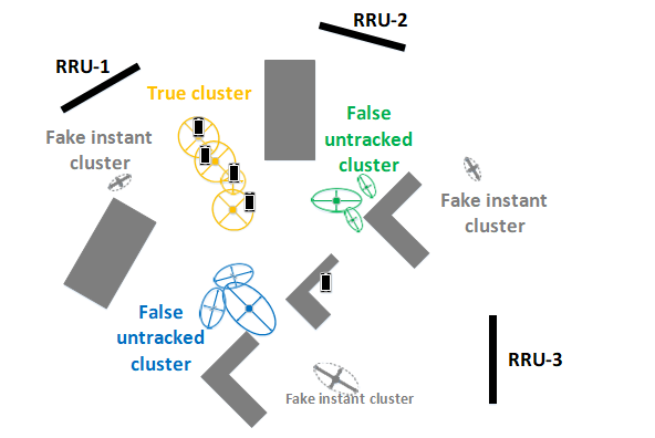 In general cases, erroneous angle acquisition may cause tracking extra directions (e.g., in music algorithm it is caused by interference) or direction miss (e.g., small search area). These errors lead to the decomposition of all positions into several remote clusters. Despite the probability of fake clusters is typically low, it slightly decreases the accuracy of estimation. To increase accuracy, we need to perform simple clustering of all positions and exclude fake clusters from consideration.