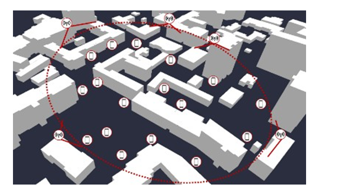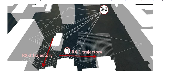 Figure 8 represents a simulated Urban Environment, parsed from the OSM map. Base stations’ antenna arrays were placed at the top of the buildings. Figure 9 shows how the RT localization principle works: