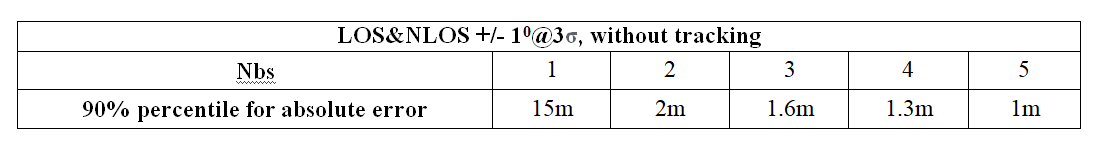 One of the main advantages of proposed positioning approach is that network time synchronization between different units is enough as well as no extra requirements for frequency synchronization needed. At the same time each 10 ns delays difference in tx/rx chains adds 4.2 meters error for 1 BS and 2.4 for 3 BSs with TDOA positioning, which is much higher than with proposed approach. But according to [31] time alignment error might be up to 65 ns between antenna ports, which makes impossible accurate AoA estimation and requires calibration procedure.