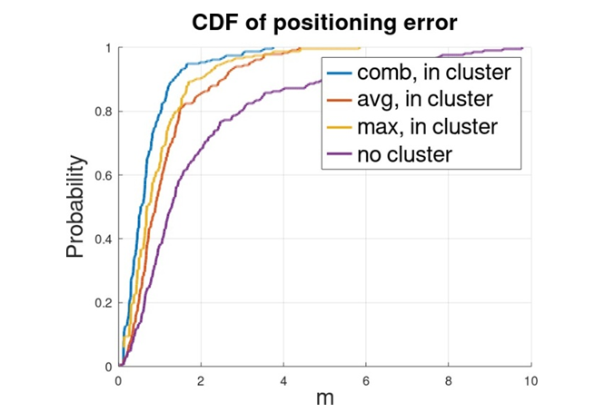 Figure 11 represents CDF of positioning error (+/- 20) with clustering and rejection of position candidates by the only flexible threshold for number of rays. Previously it was mentioned that impairments can cause fake remote position candidates to appear and decrease accuracy significantly. Such misdetection was solved with selection of the most likely cluster (e.g., in figure 12). Inside cluster several approaches can be used:
