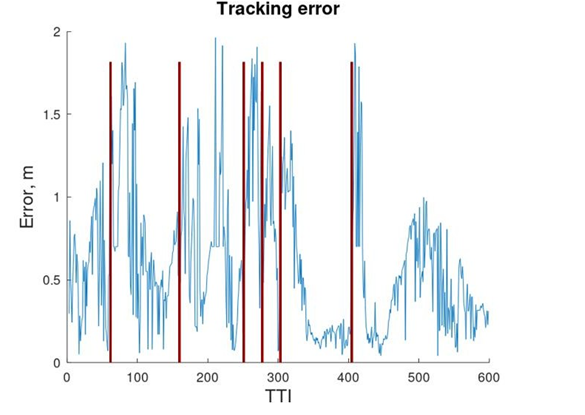 Figures 13-14 represent example of UE trajectory in NLOS and corresponding tracking error. Highest errors (above 1m) happen during direction change in sparse NLOS conditions. After UE enters LOS area (after 310 TTI, TTI = 10 frames) tracking adapts much faster and error mostly does not exceed 1m after convergence.