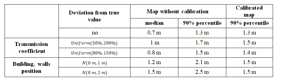 Table 2 represents decrease of positioning error in inaccurate map with proposed calibration procedure. Generally, it allows to decrease additional error with relatively small residual one. It was noticed that in cases with poor distribution of UEs in space or its small amount corresponding object was overfitted, which influenced map, but not positioning accuracy. Also, final variances of estimates after calibration were much better correlated with true positioning error (Pearson correlation is up to 0.9).