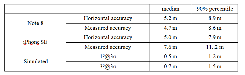 Simulation results above were compared [26] with real GPS measurements in the same outdoor positions as simulated. About 1000 measurements were done both via Samsung Galaxy Note 8 (GPS Test software) and iPhone SE (GPS Data Smart software). The following metrics were collected for each measurement: