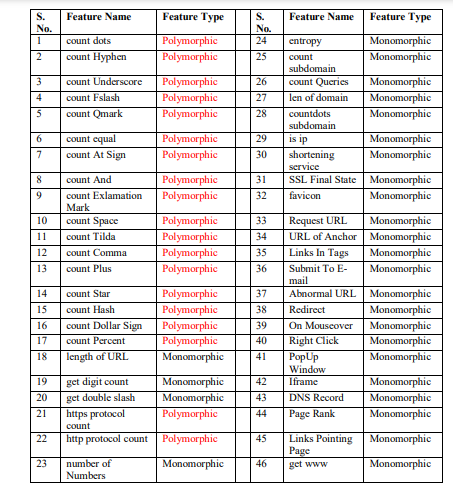 In search of finding other methods or techniques for improving the performance of machine learning models, it is found that some of the features may have polymorphic properties (same feature but different properties in different parts of the URL). For example, if the domain name wxyz.com appears in the domain part of the URL, it is normal. But if the same domain name appears in the path part of the URL; then, it signifies a phishing URL. Thus, the same feature, when considered in different parts of the URL, is found to exhibit different properties. Similarly, if special characters like ‘*’, ‘#’, ‘%’ are present in the path part of the URL, then it is normal, but if the same is present in the domain part of the URL, then it signifies phishing. Likewise, 19 features out of 46 were identified as possessing polymorphic properties from the list of features collected previously, as shown in Table 2. Table 3 presents the features with polymorphic properties and illustrates how the same feature behaves differently when extracted from different parts of the URL. Identifying such properties can enhance the ability to classify phishing URLs correctly.