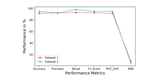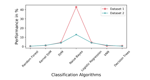 In this experiment, the features with polymorphic properties alone are considered. Out of 46 features, 19 features were identified with polymorphic properties. These 19 features were extracted from the domain part and the path part of the URL. The machine learning model was built on combining the polymorphic features extracted from the path and the domain part of the URL. This is because only features extracted from either the domain part or path part alone cannot decide whether the given URL is phishing or not. For example, the presence of a domain name in the domain part of the URL is normal but the presence of a domain name in the path part of the URL is not normal. If the model is built on the domain part or path part of the URL alone, it can lead to misclassification. Table 3 shows the list of polymorphic features and also specifies how the same features give different results when applied to different parts of the URL. After applying the machine learning models to the collected datasets, it was found that Random Forest performed better with an accuracy of 91.47% on dataset 1 and 94.80% on dataset 2, as shown in Figure5.