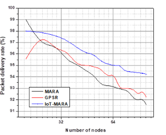 The performance of the proposed IoT-MARA algorithm is compared with the location-aided algorithm Greedy Perimeter Stateless Routing (GPSR) and Ad-hoc On-demand Distance Vector routing (AODV). In delivering the packet, the effect on the packet delivery rate is determined by the speed of nodes as shown in Figure 9. The rate of the packet delivery is gradually declined with increasing the speed of moving node. The increase in the moving speed may lead to packet loss and reduces the node’s stability. During the nodes low-speed moving, we can observe the packet delivery rate has increased in MARA. The simulated results show that IoT-MARA is a good choice for WRWSSS low-speed mobile nodes