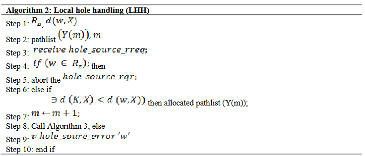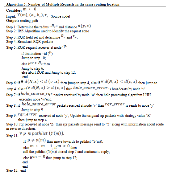 It is common for multiple requests to be sent to the same routing location in a network or system, as routing locations are typically designed to handle multiple requests at once. The process is divided into three sections: request of the route, processing of the hole, and route replay [32-35]. The process of the hole is carried out in two ways: local processing and global processing. Initially, the source node starts processing the local hole if it finds the hole during the discovery of routing. If local processing fails, then it switches to global processing. The developed pseudocode for each step is given below.