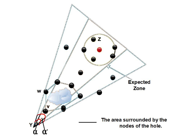 As the flame increases in a fire scenario, the discovery of route repetitions, route setting time, and route overhead create the routing holes [29]. For long-distance transmission, the proposed strategy of the triangular zone is enhancing the probability of routing holes. To solve the routing holes two methods are proposed such as local processing and global processing. Global processing is used when local processing is failed. Even if global processing failed, the ubiquitous network is flooded and the worst-case scenario occurs [30]. Figure 3 shows the basic idea of local processing algorithm. The process of routing holes is represented in Algorithm 2. Where ‘w’ is represented as neighbour node of node ‘v’, is described as data packet request to the nodes and ‘m’ is represented the number of nodes in the zone [31].