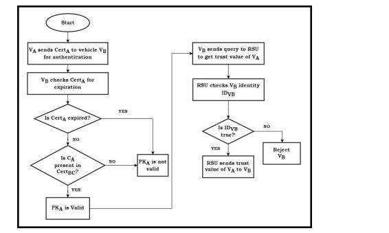 The suggested method’s next step is authentication between the networks of the vehicles so thatthey can share data with one another. When Vehicle A (VA) wants to communicate with VehicleB (VB) on the same network to authenticate its identification, VB will receive a CertA from VA asthe first step in this process. To ensure that the CertA provided at the delivery time and duration isstill valid, VB receives the certification from VA. The certificate would include signatures, VA’spublic key, and the expiration dates for CertA. Prior to verifying VA’s authenticity, VB checks thatCertA has expired. The existence of CertA in the blockchain certificate and whether it has expiredare the two limitations that need to be checked. If both conditions are met, the public key is eithervalid or invalid. Using IDVB, which is VB’s special identification number, RSU first confirms hisauthenticity. RSU ascertains the validity of the IDVB after acquiring VA’s trust value throughTrustBC and delivering it to VB. Even if the IDVB turns out to be false, the VB is still denied. Asshown in Figure 4, after determining the trust value, VB will get in touch with VA to get moredetails before proceeding to the third section.