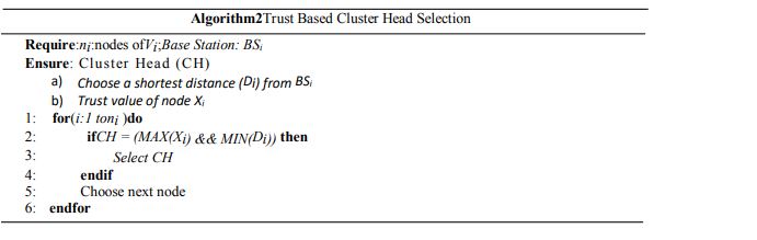 With the help of the block chain-based Trust-LEACH [34]protocol, the Cluster-Head (CH) of the suggested technique is chosen from the normal nodes. The shortest distance (Di) between base stations and a vehicle’s trust score value are the two factors that determine how the cluster head is created (Xi). When a node satisfies both requirements, it is regarded as a CH; otherwise, the procedure will continue. The random function will be called for the selection of CHs if more than one node satisfies the requirements, as described in Algorithm 2.