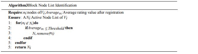 i. Blocks: A block is composed of a block header and a block body. The Block header information includes the hash, timestamp, and Merkle root of operations from the preceding block. A collection of trust score notifications that function as transactions published by mobile nodesmakes up the block contents. Inaddition, the body also maintains a table of banned nodes andconsolidated trust rankings.