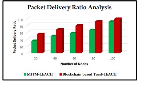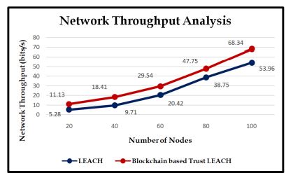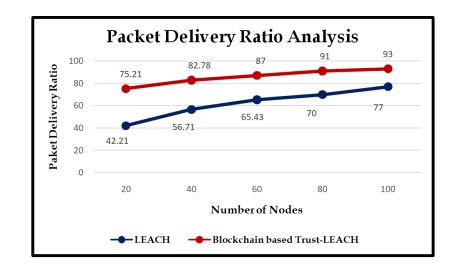The packet delivery ratio of the LEACH protocol is analyzed with our proposed blockchainbased trust-LEACH protocol as shown in Figure 14. For 20 nodes, the LEACH protocol cantransfer 42KB per second, meanwhile, our proposed method transfers 75.21KB per second. Thismeans that the proposed method has a high data transfer rate compared to the existing methods.