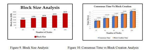 In this research, we measure the presented model’s performance in terms of how much time ittakes to create a block with a prohibited node list and obtain PBFT consensus amongst verifierson the status of operations. In this test, 25 validation nodes are used to process various blocks sizeshown in Figure9. The time needed to establish consensus and the overall amount of time neededto create each block is shown in Figure 10. It takes 7.942 seconds to construct a new block basedon 25 verifiers by varying the number of nodes in the vehicle nodes.