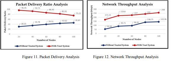 We executed the simulations frequently utilizing the same architecture, infiltrating 30% faultynodes, to examine whether the efficiency might be optimized by including the developedframework. We first tested it using the conventional Routing protocol, and afterward, we testedthe alternative AODV using a blockchain security framework. It should be noted that all theseattacker nodes may be a solitary black hole attack station that drops messages or several nodesconstructing tunneling that ingest the internet traffic. Without trust and with a 30% attacker nodepresent in the first scenario, it is evident that perhaps the bandwidth utilization in bits per secondand packets throughput significantly decreased, as depicted in Figure 11. From Figures 11 and12, we can be concluded that integrating the suggested model into the VANET system will resultin a large decrease in the packet delivery ratio and an increase in performance in bits per second.
