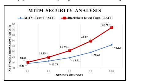 The MITM (Man In The Middle) assassination attempt, which disrupts the channel’s ongoing conversions, is introduced into the blockchain-based Trust-LEACH mechanism. Theauthentication system of the networks is employed to safeguard the entire network from suchkinds of assaults. Only nodes that have their identities recorded in the blockchain network areallowed to become participants in the vehicle network. Without authorization, they can’t beeligible to communicate in the system, every node is validated at the time of registration itself.Figure 15 demonstrates how the hacker attempts to detect and tamper with the packets receivedduring the conversation. In a MITM attack, the adversary carries out intrusion attempts byaltering the packet header or delivering inaccurate info. Due to malicious activity, the actualpackets are not transmitted whenever data are delivered from surrounding vehicles to CHs andBS respectively. The intruders repeatedly send malicious files in the direction of the destinationnode. The network’s performance diminishes when intrusions are initiated since only fraudulentmessages are delivered to the target point. The network performance is determined following theidentification of intruders via simultaneous registrations and authorization. Whenever the systemis clear of intruders, the system data transfer rate/throughput will increase tragically. The packetdelivery ratio of the proposed method is analyzed against MITM attack nodes in Figure 16.