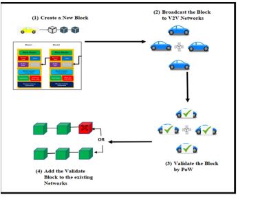 Figure 1 shows an example of transactions in a VANET network. A new block is created by a vehicle node and sent to the vehicle network. Other vehicle nodes try to solve the PoW problem, known as mining. A block became legitimate when the PoW was solved, and it will be included in the chain. Blockchain has so many unique features compared to recent technologies like distributed nature, immutability, security, privacy, and also transparency. From the above features, we are motivated to give a solution for routing mechanisms for VANET’s applications by incorporating blockchain concepts over VANETs.