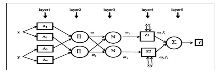 where: A1 and A2 are the fuzzy linguistic values of input x, A3 and A4are the fuzzy linguistic values of input y,f1 and f2 are a linear combination of inputs with constant terms, p1, q1, and r1 are the parameters of the first linear combination f1, and p2, q2, and r2are the parameters of the first linear combination f.