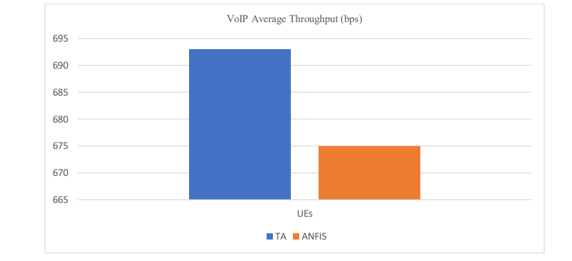 Figure 14 compares the average VoIP frame throughputs of all UEs using ANFIS and TA. Because ANFIS constrains the number of received/transmitted packets, it lowers the throughput. In contrast, the TA by default increases the number of received/sent packets from the UE directing the throughput; therefore, the UEs using TA present higher VoIP average throughput than UEs using ANFIS.