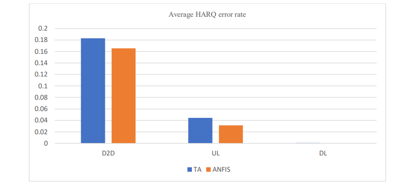 Hybrid Automatic Repeat Request (HARQ) combines ARQ with forward error correction (FEC). When a sender receives no acknowledgment (ACK) before timeout, it re-transmits the package assuming that the receiver has discarded the bad packet. The HARQ error rate measures the number of bad packets. Recall that ANFIS processes fewer transmitted/received packets than the TA; therefore, fewer packets reach their destinations before the timeout and more acknowledgments (ACKs) are returned to the sender. Consequently, ANFIS lessens the need for ARQs and reduces the FEC and HARQ error rates in D2D, UL, and DL communications. Figure 7 compares the average HARQ error rates in D2D, UL, and DL using ANFIS and TA.