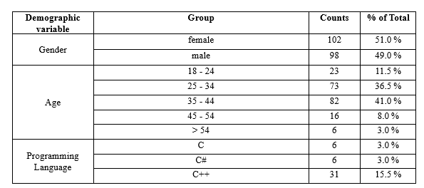 A total of 269 respondents participated in the survey. Two hundred responses were accepted after screening and data quality checking. One hundred and two or 51% of the participants were female, and 98 (49%) were males. Most participants were aged between 35 – 44 (n=82). JavaScript and Java were the most cited primary programming languages, accounting for 20% and 17.5% of participants’ primary programming languages. C++ (n=31), Python (n=26), and PHP (n=18) were the following popular languages making up 15%, 13%, and 9% of participants’ primary programming languages, respectively. Cloud, web, and internet (n=59) was the most deployed application platform among respondents. Mobile devices (n =53), smart devices (n=38), and personal computers (n=21) were the following most stated primary deployment platforms. One hundred and twenty-seven participants claimed they were not given application security training, while 73 claimed they had application security training. Table 1 summarizes the participant demographics.